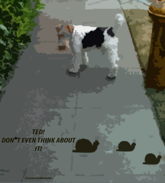 Ted loves to roll in the smelliest stuff on the planet.  Elephant vomit?  Oh yes please, I’ll roll in that. Raccoon Pooh? Oh, I’ll have double of that please. Ted, like most dogs, has a taste for weird things, horse pooh, rotten stuff, the smellier the better and last year, it was rotten snail slime, preferably wet dead snail still in the shell.  He or rather I, paid the price for that tasty treat.  He treated me to his upset stomach that lasted for more than a day. But, I was lucky it was just an upset stomach with the most foul stuff coming out of him. Even he wanted to turn the other way!