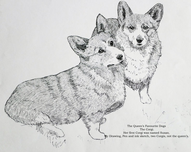Two lovely little corgis pen and ink drawing(c)susansheldonnolen