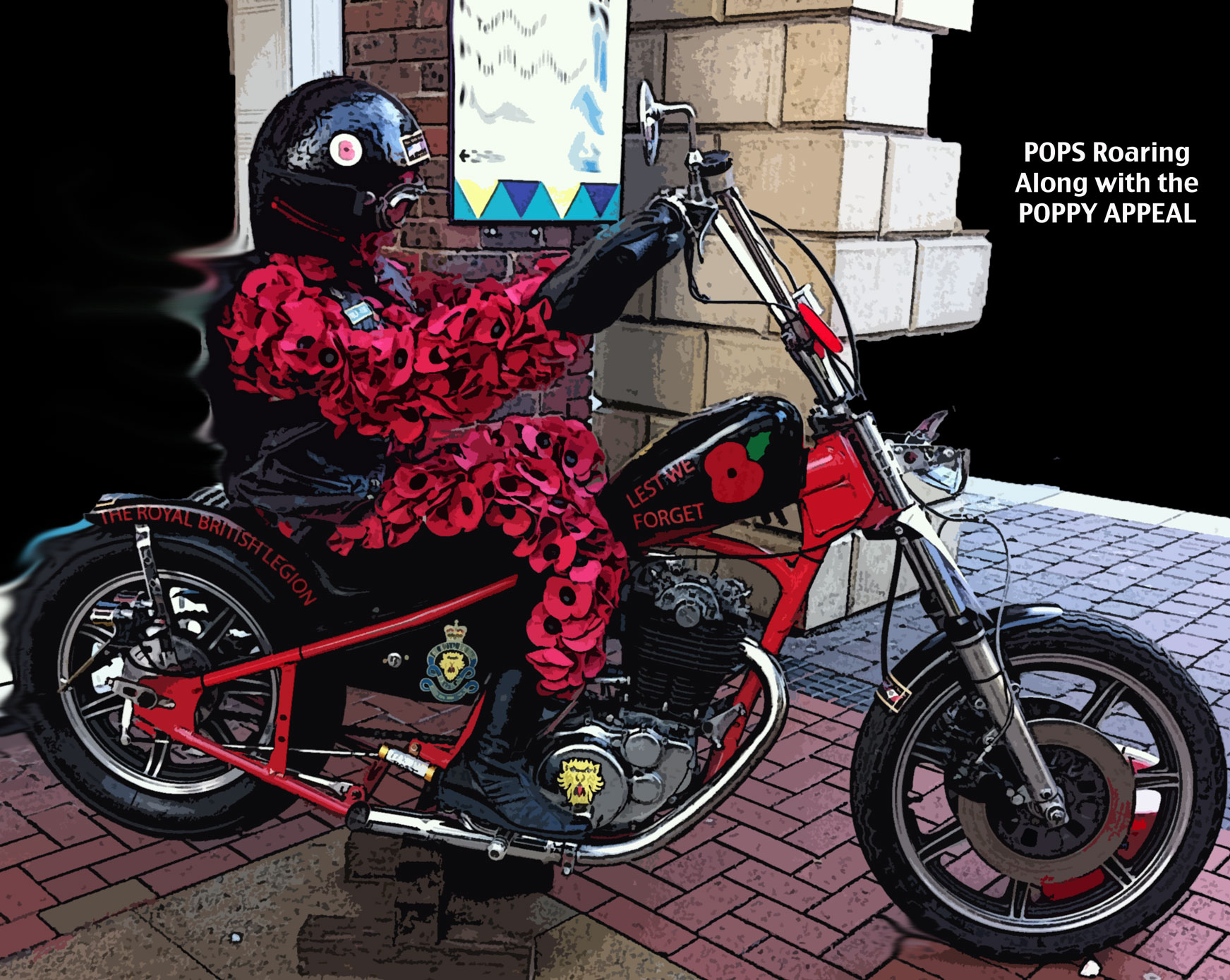 It’s November, and the little red poppies are colouring winter lapels. It’s a bit of bright red cheer in the gloom of approaching winter. I came across Pops just by chance on a walk about. Pops was made by a wife of one of the members of the Royal British Legion. She used 1,000 poppies to make him. Sadly, she has since passed, but Pops proudly sits on his XT500 Motor Bike, originally built some 31 years ago. His roaring bike rebuilt by Neil, who whilst selling poppies, told me that the bike came back home in bags, all the motor parts in bits and pieces. All of this hard work was done with such care and compassion for the Poppy Appeal.