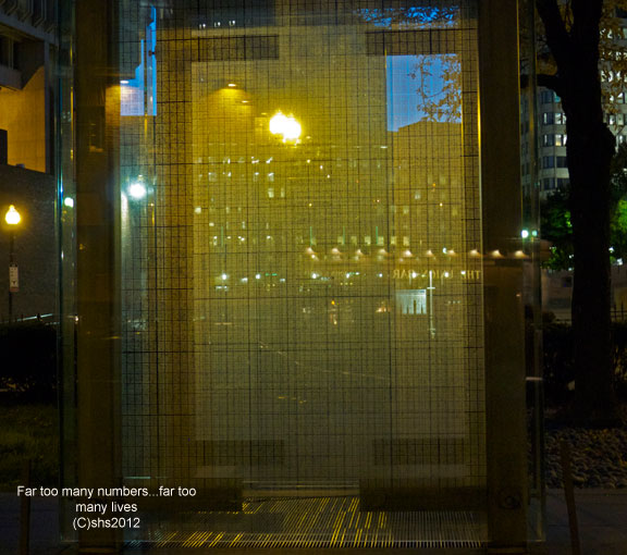 At night between the grid, lights turn on illuminating the numbers like stars. Numbers…souls….