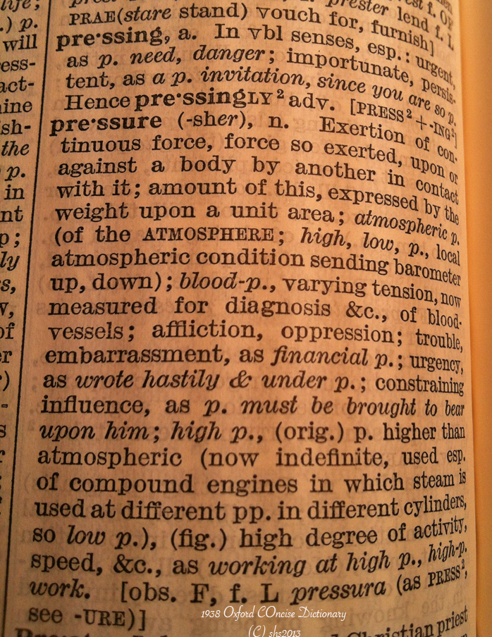 It was just over the last few years that I began to notice quite a few people using the term pressurised me as in…. I feel so pressurised. I was pressurised into taking that job.  I thought this was just a new cool usage of the word and wondered when it had become so commonplace.  It’s just not a usage that I am familiar with. I need to get to the bottom of this before the pressure boils up to an uncomfortable level and I am pressurised.