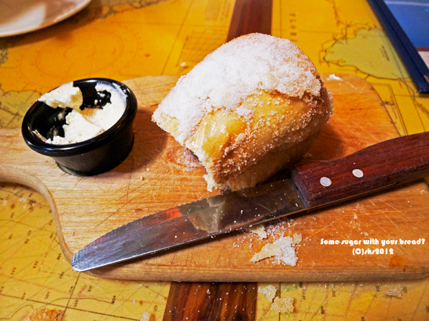 Bread is a commonplace pre meal offering, which I find odd in one way. You fill up before the real meal arrives, so I usually avoid it, that is unless I am in an Italian restaurant and then I just can’t avoid the fresh-baked olive rolls, with bits of olives snuggling about, just begging to be dipped into a pool of Balsamic vinegar and olive oil. Oh heaven and who cares about those calories! Today’s bread was a shocker to me. It was white bread, and looked as if someone had dunked the top into water and then smooshed it into white granular sugar. I cut into it to make sure, and sure enough that was what it was. I am always one to try new things, so I did. It tasted like white bread dipped in sugar and absolutely devoid of flavour. This had me seriously worried about the meal ahead of me. So, I asked the waitress about it. Not a good idea.