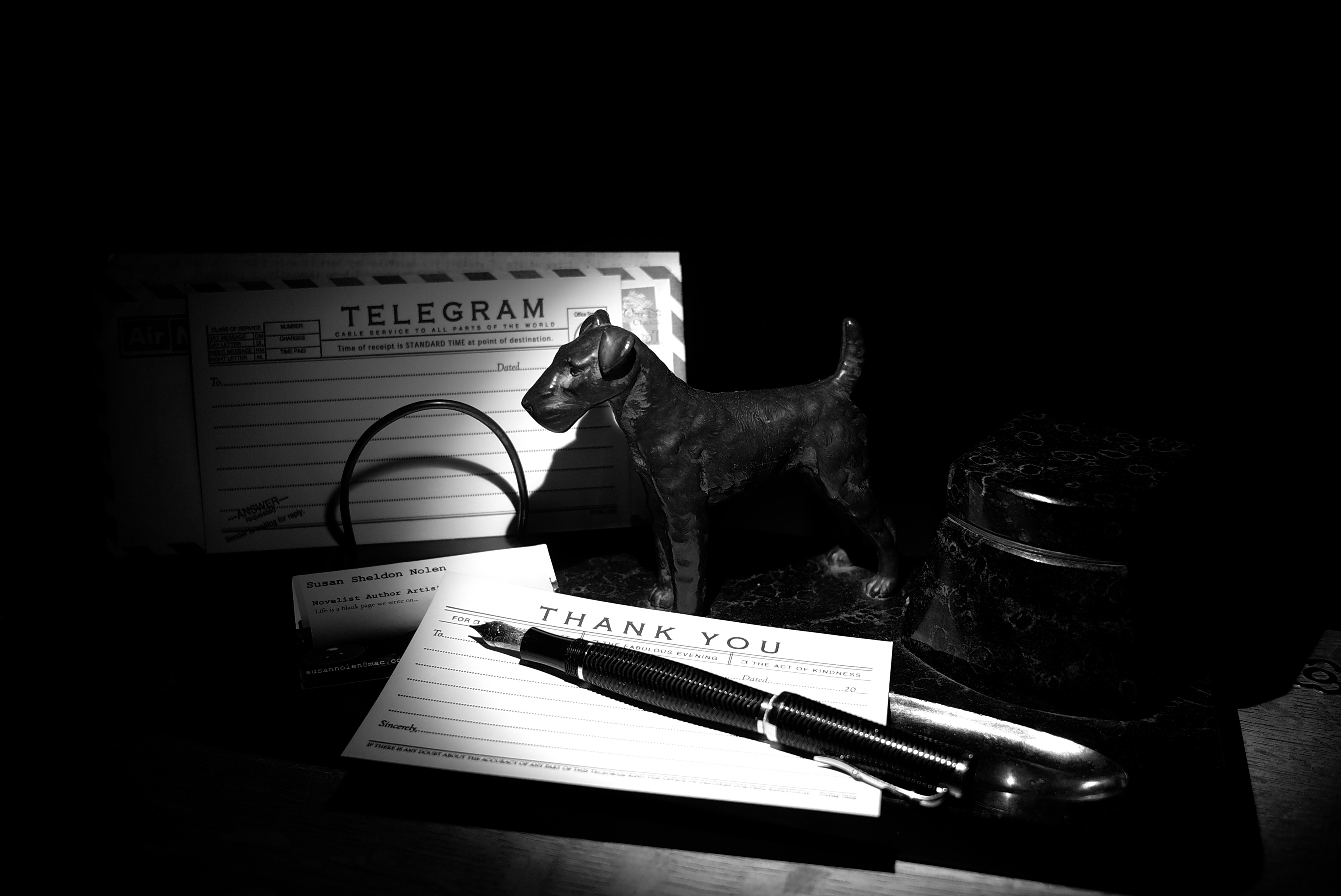 Photograph in black and white of the author’s desktop, ink pen, inkwell, and tube tickets. Susan Sheldon Nolen
