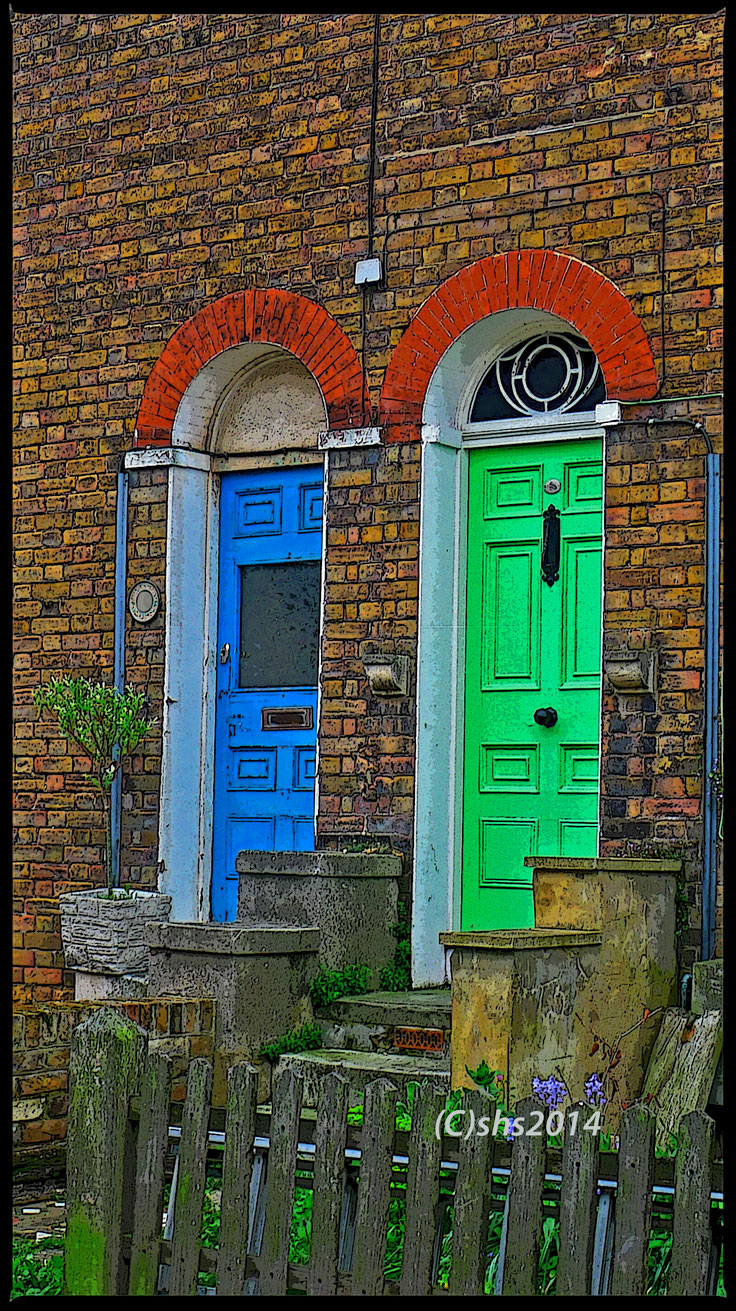 I agree with what Seven said, and also I find it is so interesting how those doors are so similar – side by side and in the same brick – but yet SO different – like not just in color – but the mail slot and the window on the blue one – but not on green – and then how the green one has the ornate arch window above it and the blue one does not. Lots of little thing s- this is truly a gem of a shot!