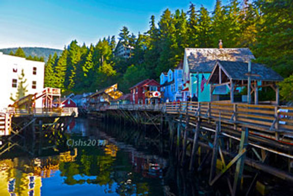 Entrance sign to Ketchikan Alaska by susan sheldon nolenKetchikan was poetically charming and as the sign declares, Alaska’s First City! The entrance to the city was of course what one would expect stepping off a cruise boat. Jewellery shops galore, and endless souvenir shops for that last chance tee-shirt, all fought for the coins in the purse. I headed off toward the old historic part of town where the whore houses and dead salmon haunt the wooden boards.
