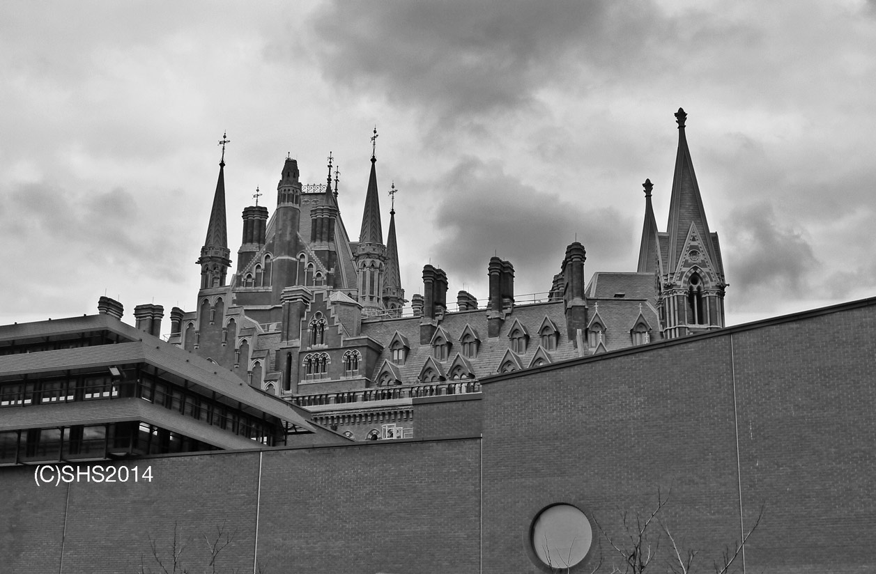 Here is a shot of the stunning St Pancras Hotel, peering over the stark modern building of the British Library. Modernity, history, all blending into one stormy sky. Black and White #20 London Old and New.