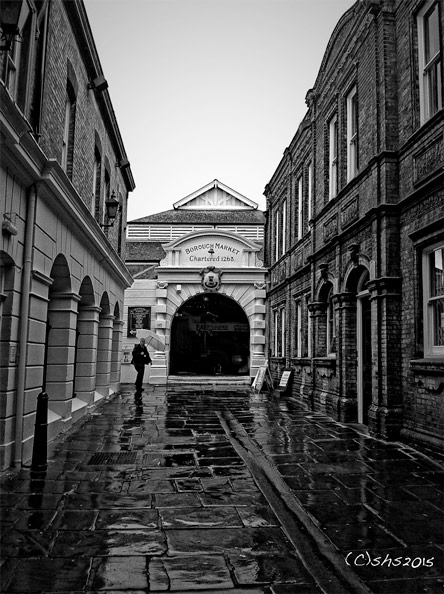 This is one of the oldest operating markets in England. It was first chartered  in 1268. Still in operation in Gravesend, Kent, England. I caught this image with the old iPhone 4. This week’s offering in Black and White, Rain in the Market.